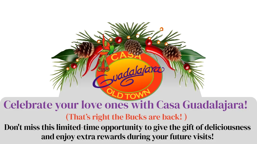 The Casa Guadalajara gift card promotion is a limited-time holiday season offer where customers can purchase gift cards and receive additional Casa Guadalajara Bucks as a bonus. Buy $50 in gift cards and get $10 in Casa Guadalajara Bucks, or buy $100 in gift cards and get $25 in Casa Guadalajara Bucks.