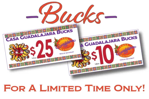 Guadalajara Bucks are certificates that can be used like cash on your next visit to Casa Guadalajara. They enhance your dining experience by offering additional value, although they have no cash value and no cash was paid for them.